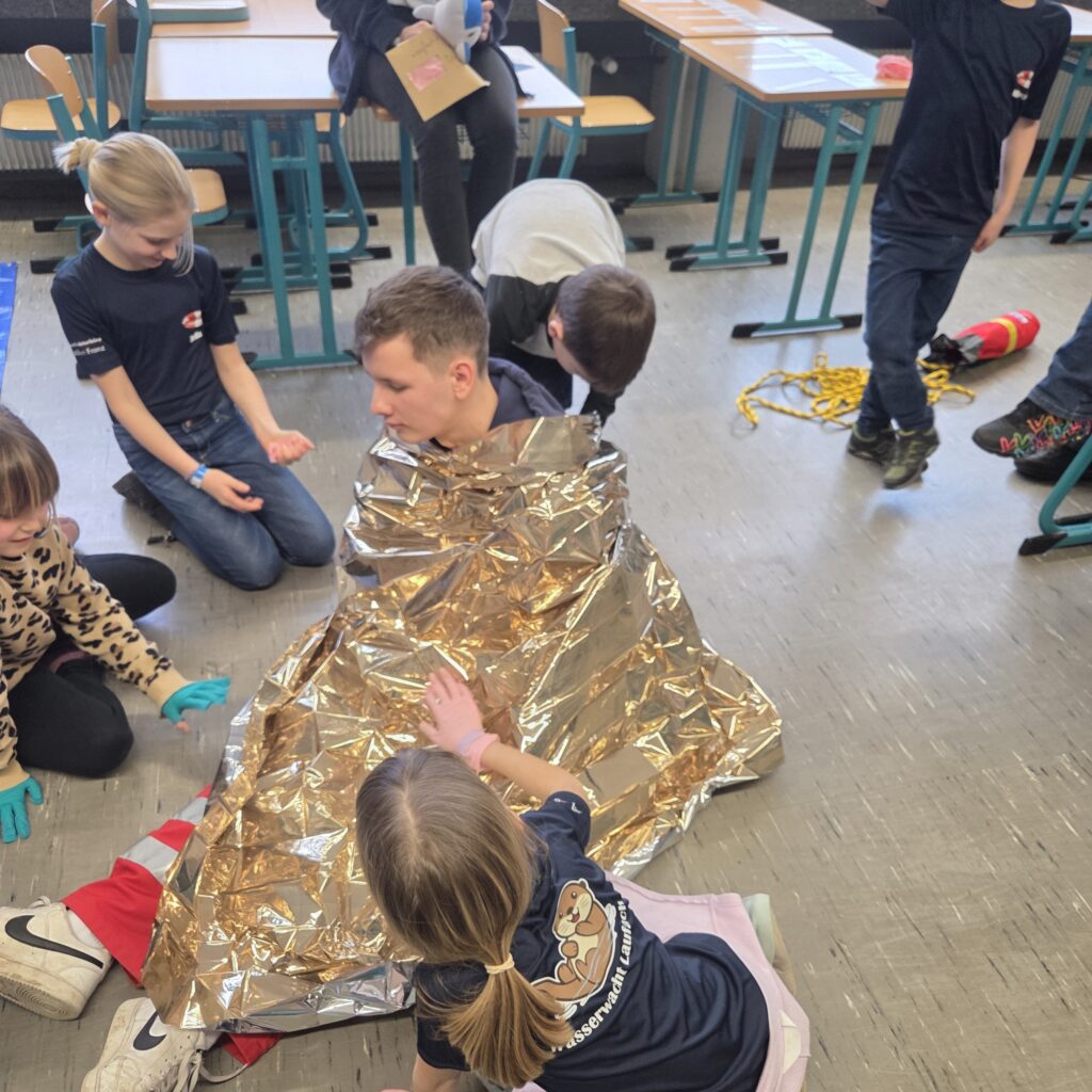 Nach einer gemeinsamen Mittagspause folgte ein abwechslungsreicher Stationenlauf. Hier wurden sowohl theoretisches Wissen als auch praktische Fähigkeiten aus den Bereichen Erste Hilfe und Wasserwacht abgefragt – natürlich durften auch passende Spiele nicht fehlen.